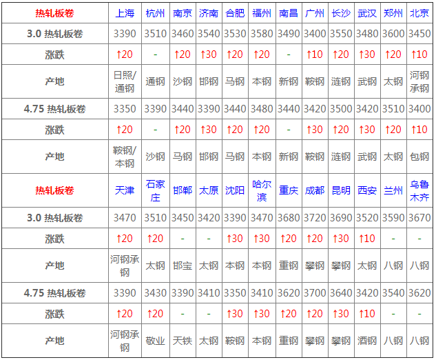 熱卷24個市場中18個市場上漲10-30,4.75熱軋板卷平均價格3463元/噸,較上個交易日上調17元/噸;