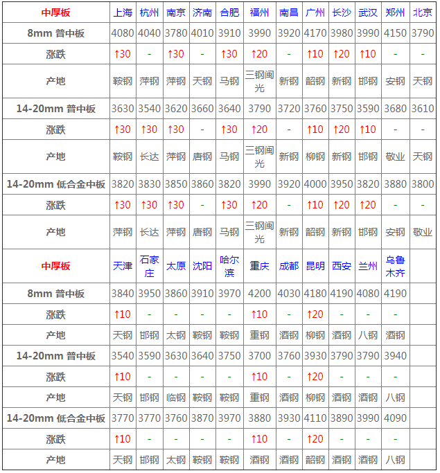 中板24個市場中10個市場上漲10-30,14-20mm普中板平均價格3698元/噸,較上個交易日上調10元/噸;
