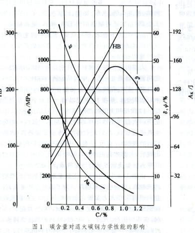 力學性能 碳含量對退火碳鋼力學性能的影響如圖1所示。由圖1可知,隨碳含量增加,碳鋼的伸長率、斷面收縮率和沖擊韌性下降,而硬度上升;但是抗拉強度先是上升,然后下降。碳鋼力學性能與碳含量的關(guān)系反映了碳鋼顯微組織與碳含量之間的關(guān)系。鐵素體是軟而塑性好的相,滲碳體是硬而脆的相。