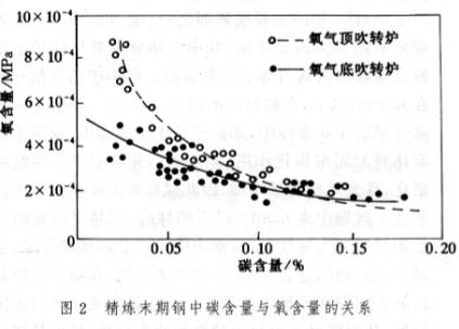 (5)氧。鋼中有害元素。由于煉鋼前期加入礦石、吹氧或吹空氣,鋼水中不可避免地溶有一定的氧。在精煉的末期,鋼中氧含量取決于碳含量。碳含量高,則氧含量低。氧氣頂吹和底吹轉(zhuǎn)爐精煉末期,鋼中碳含量與氧含量的關(guān)系如圖2所示。