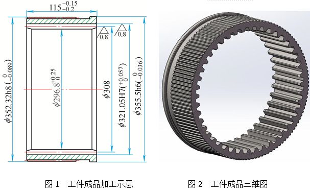 由圖示1上的標注的具體尺寸可以看出,齒側及齒根與外齒配合面,光潔度要求0.8μm,齒頂為非接觸面,光潔度無要求,只需滿足公差要求,故齒側及齒根滲碳淬火后需要磨齒機進行磨削達到圖紙要求的光潔度,齒頂在滲碳淬火數控車至圖樣要求的尺寸,滲碳淬火后不需要加工。滲碳淬火前內齒側及齒根單邊留有0.4mm余量,若齒側及齒根余量加大,表面滲碳淬火層中硬度和近表面良好金相組織將會被加工掉,并且會造成磨齒機的效率降低,成本增加。若滲碳淬火整個熱處理變形超過0.4mm,即后序磨齒無法加工。