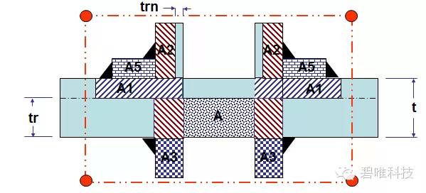 在ASME標準中用等面積補強法計算時,對于這種非常典型的徑向開孔,計算是很方便的,簡單的說就是在補強范圍內,用筒體、接管、補強板、焊腳提供的面積補回被挖掉的面積就可以了,如下圖: