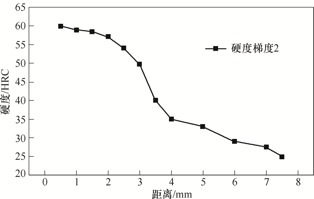 同試驗1制作步驟并進行了熱鍛工藝試驗,H13材質熱鍛標識模具鑲塊(滲層硬度梯度見圖7),與調質態(tài)該材質模具鑲塊比較,在同樣工況下模具壽命提高2~3倍,模具消耗降成本2.3元/件左右。