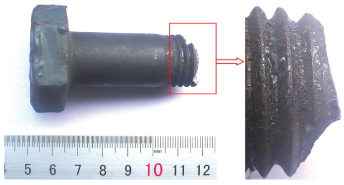 據(jù)委托方介紹,來(lái)樣為M20鋼結(jié)構(gòu)大六角頭螺栓,等級(jí)為10.9S,材質(zhì)為20MnTiB。該螺栓為舞臺(tái)桁架聯(lián)接螺栓,舞臺(tái)于2012年竣工,在2015年12月1日檢修時(shí),管理人員發(fā)現(xiàn)劇院舞臺(tái)有螺母掉落。該舞臺(tái)桁架用于掛設(shè)劇院舞臺(tái)幕布,由于桁架使用過(guò)程中,部分螺栓掉落,2016年3月2日施工單位進(jìn)行檢修并更換了19顆螺栓。現(xiàn)場(chǎng)采用高強(qiáng)螺栓軸力扭矩復(fù)合測(cè)試儀對(duì)舞臺(tái)桁架的高強(qiáng)螺栓聯(lián)接狀況進(jìn)行了檢測(cè),發(fā)現(xiàn)原有螺栓扭矩及預(yù)拉力基本符合規(guī)范要求,部分螺栓存在預(yù)拉力過(guò)大現(xiàn)象,部分螺栓螺桿有變形,無(wú)法將螺栓取出。此外,委托方未能提供螺栓具體生產(chǎn)工藝、現(xiàn)場(chǎng)安裝等相關(guān)詳細(xì)信息。為找到斷裂原因,消除安全隱患,筆者對(duì)斷裂螺栓進(jìn)行了失效分析。對(duì)螺栓斷口形貌進(jìn)行觀(guān)察,如圖1、圖2所示。螺栓大六角頭部涂有灰色防銹漆,桿部呈黑色,螺栓斷裂于距螺桿第2~3牙螺紋牙底,該部位應(yīng)為螺母緊固界面處,無(wú)明顯塑性變形。斷口至螺桿間螺紋呈褐黃色,存在明顯銹蝕痕跡。