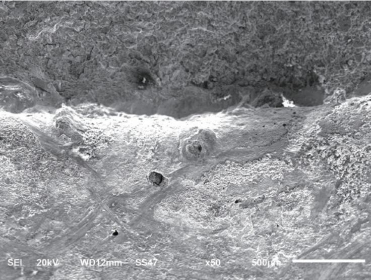 斷面起伏較大,高度可達(dá)兩牙高度,且有些銹蝕。斷面顏色呈黑色和灰色兩區(qū)域,黑色區(qū)域可見(jiàn)明顯的放射線(xiàn)條紋,且匯聚于一側(cè)螺牙底部,低倍下放大后可見(jiàn)一些閃光小刻面,呈脆性斷裂特征。裂源兩側(cè)周向邊緣存在剪切唇特征。灰色區(qū)域斷口與軸向呈一定角度,斷面較粗糙,為后續(xù)擴(kuò)展斷裂區(qū)域。
