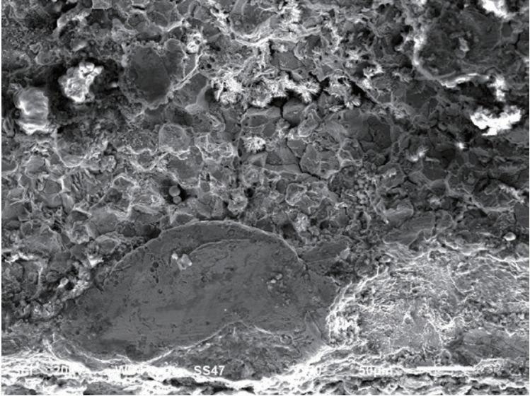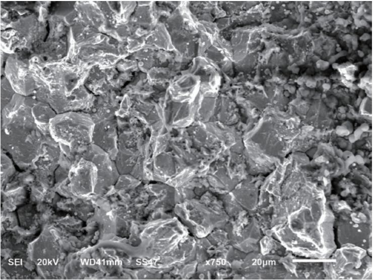 將螺栓斷口清洗后置于掃描電子顯微鏡下觀(guān)察:①裂紋源區(qū)可見(jiàn)明顯的放射線(xiàn)形貌,呈冰糖狀沿晶斷裂形貌,放大后晶面上可見(jiàn)雞爪痕、微小孔洞形貌,斷口可見(jiàn)大量沿晶二次裂紋形貌,呈氫致開(kāi)裂特征。裂紋源附近螺牙表面可見(jiàn)銹蝕孔洞,如圖3~圖8所示。