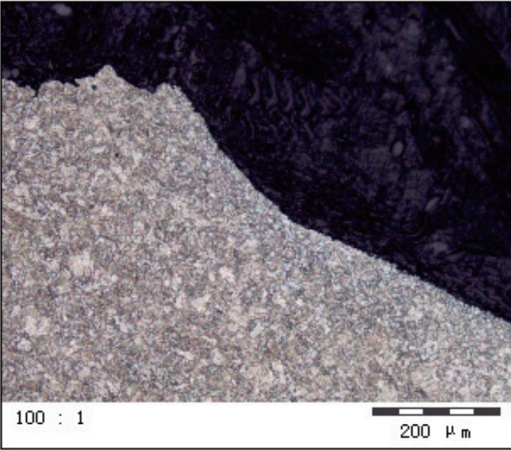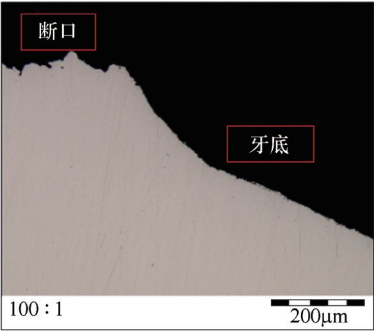 圖11、圖12為裂紋源拋光態(tài)及顯微組織形貌,從圖中可見(jiàn),裂紋源部位未見(jiàn)明顯的非金屬夾雜物聚集,腐蝕后無(wú)明顯的熱處理缺陷。斷面以沿晶斷裂形式擴(kuò)展,斷口未見(jiàn)脫碳及氧化特征。圖13為斷裂螺紋相鄰牙底,未見(jiàn)裂紋及明顯缺陷。