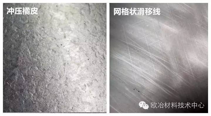 鋼板在發(fā)生時效后沖壓,位錯、晶界被間隙原子擠住,難以動彈,變形不均,導(dǎo)致鋼板表面出現(xiàn)橘皮狀粗糙不平或斜條紋狀的“滑移線”。(詳細定義可查詢歐冶三寶之 — “缺陷通”)