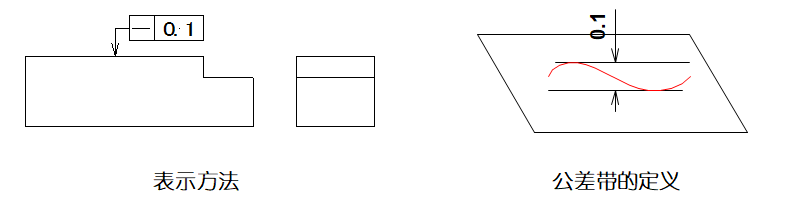 ▲圖樣示例1:在給定平面內(nèi),公差帶必須在距離為0.1mm的兩平行直線間的區(qū)域。