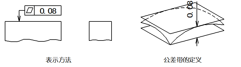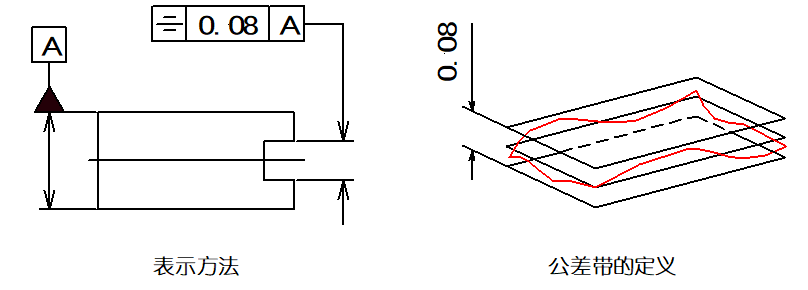 ▲圖樣示例:公差帶是位于距離0.08mm的兩個(gè)平行平面之間的區(qū)域。
