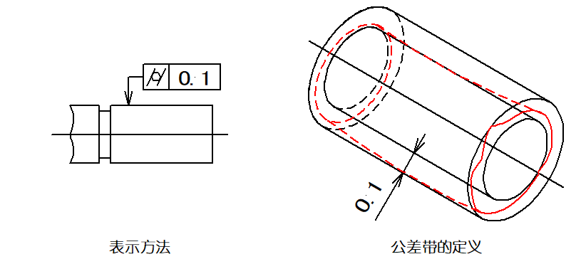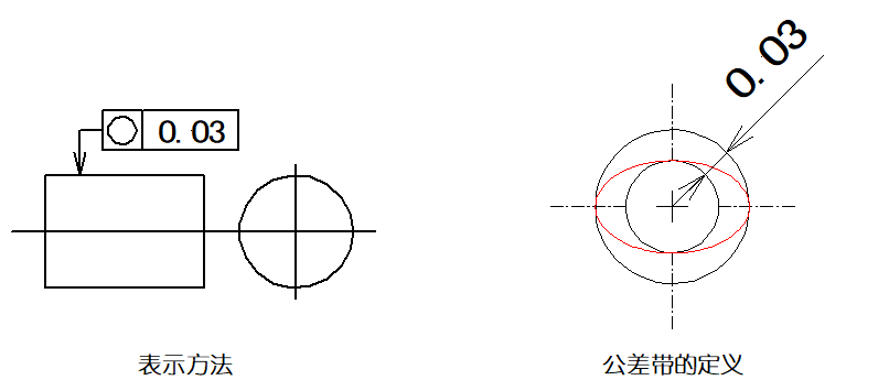 ▲圖樣示例:公差帶必須在同一正截面上,半徑差為公差值0.03mm的兩個(gè)同心圓之間的區(qū)域。