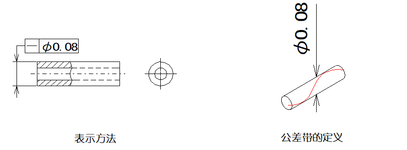 ▲圖樣示例2:在公差值前加注記號(hào)φ、則公差帶必須在直徑0.08mm的圓柱面內(nèi)的區(qū)域。