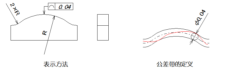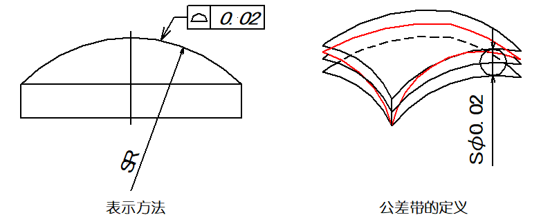 ▲圖樣示例:公差帶是由包絡(luò)一系列直徑為0.02mm的球的兩條包絡(luò)線之間,諸球的中心理論上應(yīng)位于理論正確幾何形狀的面上。