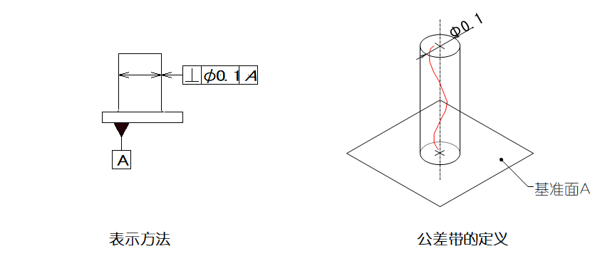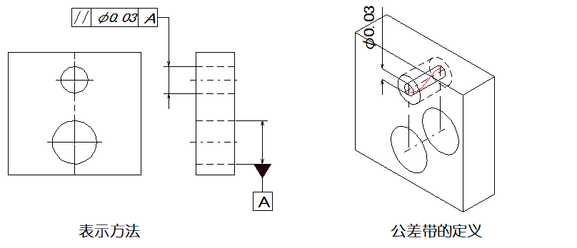 ▲圖樣示例:如公差值前加注記號(hào)φ、則公差帶為基準(zhǔn)平行直徑φ0.03mm的圓柱面內(nèi)。