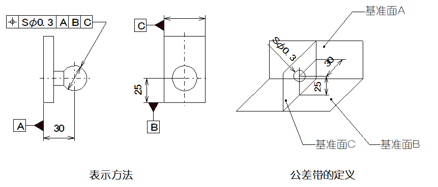 ▲圖例說(shuō)明:公差帶前加注記號(hào)Sφ時(shí)、公差帶是直徑0.3mm的球內(nèi)區(qū)域。球公差帶的中心點(diǎn)的位置是相對(duì)于基準(zhǔn)A,B及C的理論正確尺寸。
