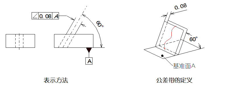 傾斜度是表示零件上兩要素相對(duì)方向保持任意給定角度的正確狀況。傾斜度公差是被測(cè)要素的實(shí)際方向,對(duì)于基準(zhǔn)成任意給定角度的理想方向之間所允許的最大變動(dòng)量。
