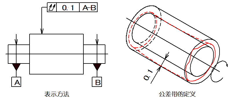 ▲圖例說(shuō)明2:公差帶是在與基準(zhǔn)同軸的任一半徑位置的測(cè)量圓柱面上距離為0.1mm的兩個(gè)圓之間的區(qū)域。